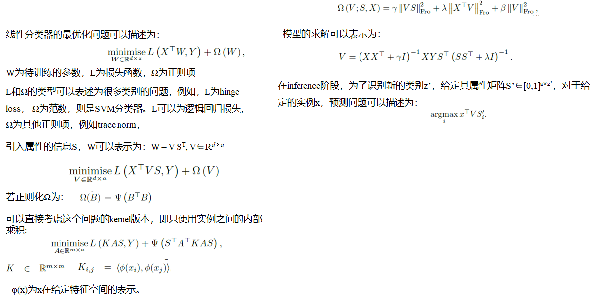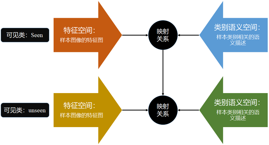 在零次学习(ZSL)中,训练集中的样本标签与测试集的标签是不相交的,即在训练时是没有见过测试集类别的样本的,而零次学习任务就是要识别出这些训练时没见过的类别的样本。既然要认出没见过的对象,那就要教会模型学习到更“本质”的知识,并且将这些知识“举一反三”,从已见过的类别(seen)迁移到没见过的类别(unseen)。在具体的实现中,模型会使用一层语义嵌入层,作为seen类和unseen类的迁移桥梁或者说中间表示,将seen类的知识迁移到unseen类,教会模型”举一反三“。而这个语义嵌入层具体会是对类别的一些描述,具体可能会是人工定义的属性或者词向量等语义表示。
