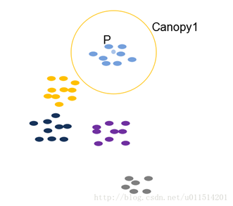 (1)原始状态下的数据还没有分类,所以从集合中取出一点 P,将 P 作为第一个类, 我们也将这个类称为 Canopy。