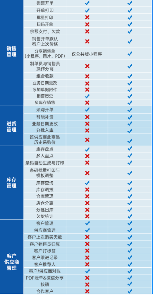 性价很好,总体功能非常齐全,除了配备销售、采购、库存管理以外,还提供营销功能,比如商品云相册、微信自动化、微商城、秒杀宝、会员卡等;亮点功能如:欠货统计、扫码入库、库位功能、主辅功能、批量推款、订单入库、快速开单等,很推荐大家使用。