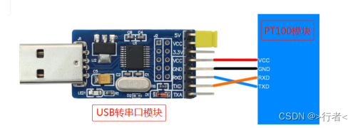 一定要保证USB转串口模块与PT100模块的串口要交叉连接,即