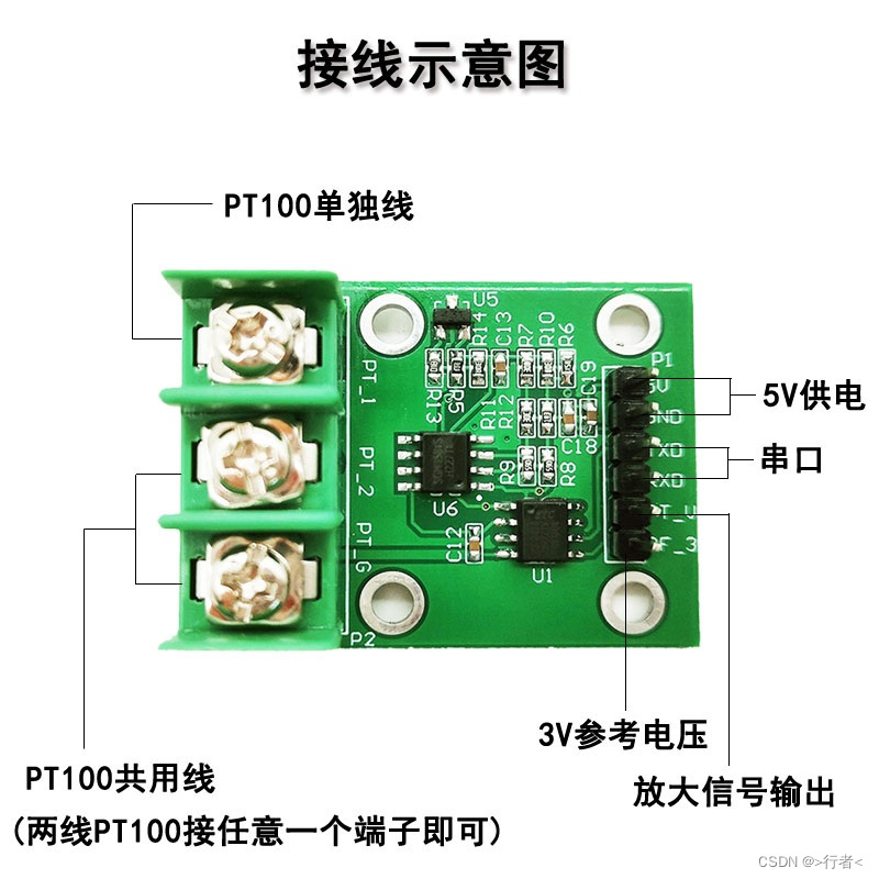 模块可接入两线或三线制接口的PT100传感器,其中三线制接法的优点是将PT100的两侧相等的的导线长度分别加在两侧的电桥臂上,使得导线电阻得以消除,使得测量误差减小。