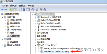 模块可通过外接USB转串口模块与电脑上位机通信,查看USB转串口模块在电脑上的端口号,在电脑设备管理器中查看,端口号因个人电脑而异,如下图: