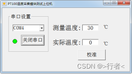 通信成功后上位机会显示当前测量到的温度,上位机默认以1秒为周期自动发送读取指令。如需校准温度,可将当前实际温度填入“实际温度”文本框中,并点击校准即可将校准温度值指令发送至PT100模块,校准成功后则会弹窗提示“校准成功”。