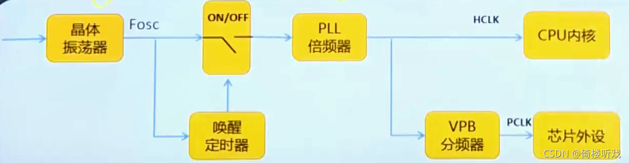 意义:时钟是嵌入式系统的脉搏,处理器内核在时钟驱动下完成指令执行,状态变化等动作,外设部件在时钟的驱动下完成各种工作,比如串口数据的发送、A/D转换、定时器计数等等。因此时钟对于计算机系统是至关重要的,通常时钟系统出现问题也是致命的,比如振荡器不起振、振荡不稳、停振等。HCLK高速时钟、PLCK低速时钟。