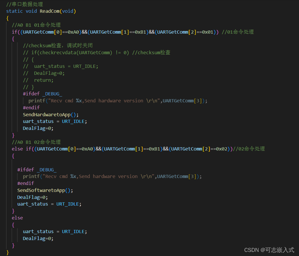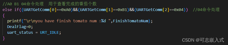其次,设置DealFlag=0;表示完成指令。设置uart_status = URT_IDLE;以便进行下一次数据接收
