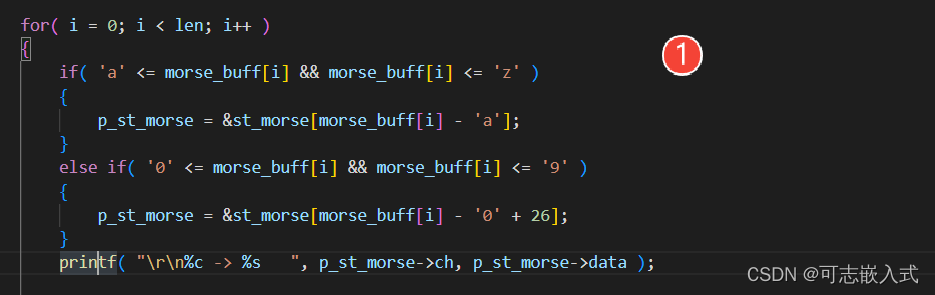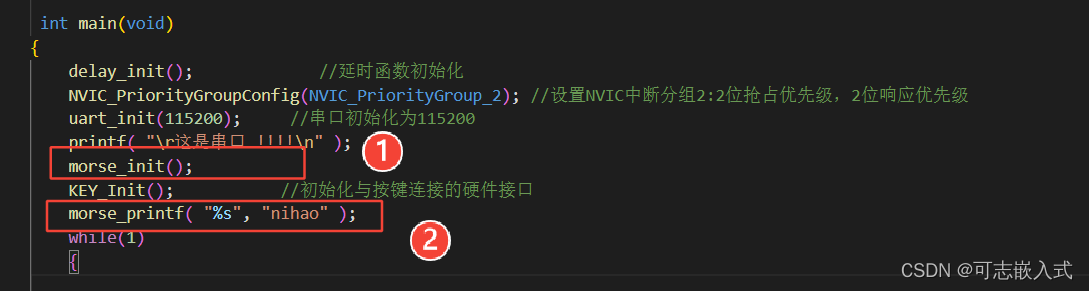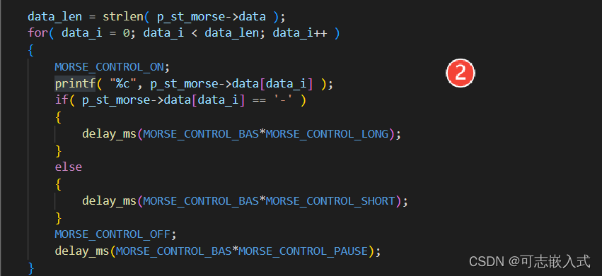 其次,不定长函数morse_printf实现两个功能(1):将摩尔斯电码通过串口打印显示。(2)将摩尔斯电码通过GPIO外接的led输送给外界。