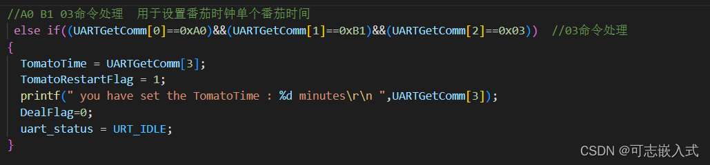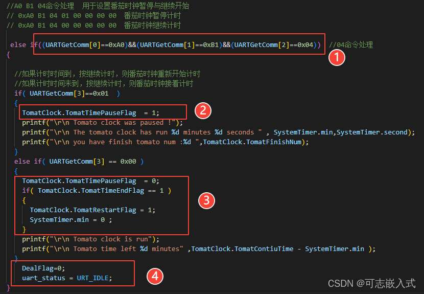 再次,判断若指令UARTGetComm[3] == 0,则设置标志位TomatTimePauseFlag为0,这样定时器中断函数中,SystemTimer.second自增,并再次判断,如果番茄时钟时间截至标志位TomatClock.TomatTimeEndFlag 为1,设置番茄时钟重新启动。