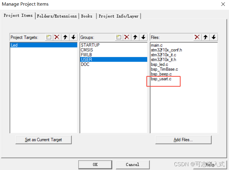 其次,在keil工程内将鼠标右键放在USER目录上,右键选择Manage Project Items,在USER目录下添加bsp_usart.c文件,