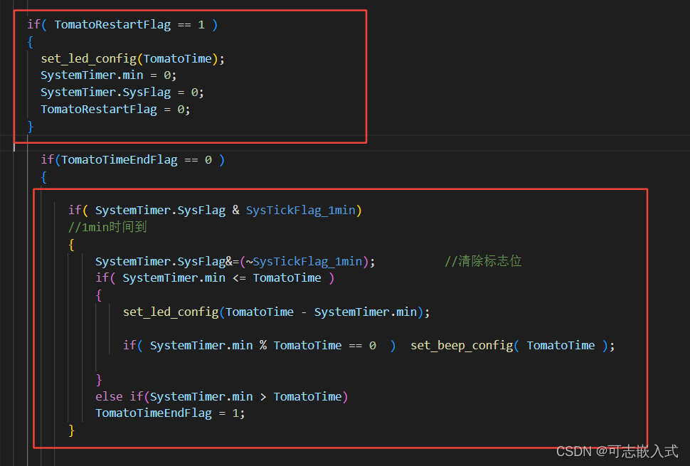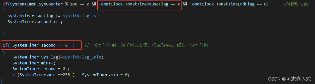 首先,进入定时器中断函数,检测TomatClock.TomatTimePauseFlag不为0后,SystemTimer.second停止自增,进而SystemTimer.second == 6 条件不满足,分钟标志位停止更新。
