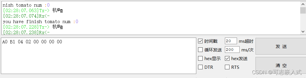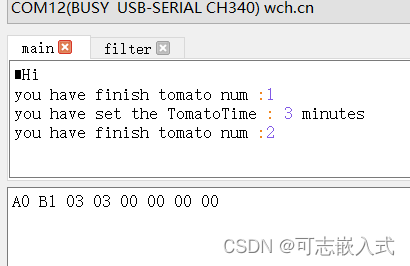 3.当一个番茄时间完成后,会自动通过串口发送共完成的番茄个数
