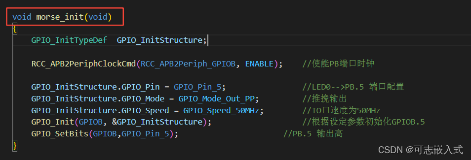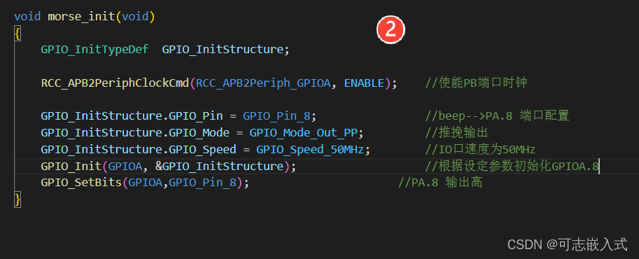 首先, morse_init函数实现对摩尔斯电码GPIO引脚的初始化,后续可以通过GPIO对应的蜂鸣器将信号以声音的方式发送出去。