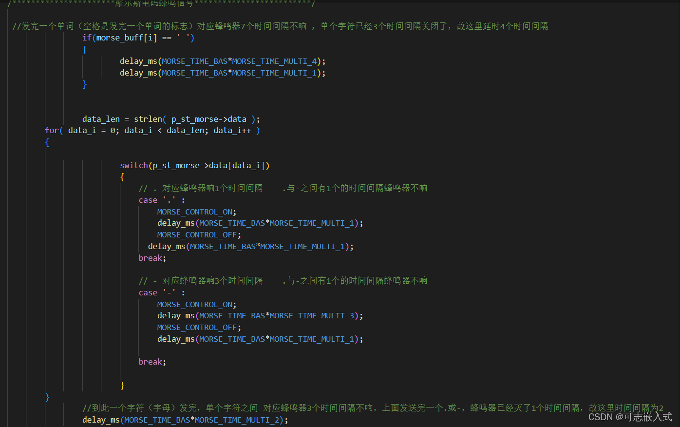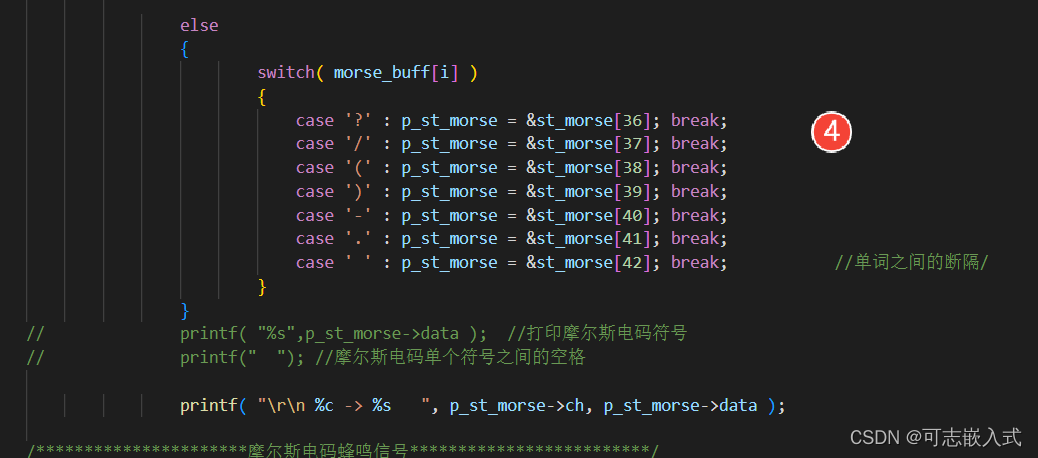 其次,在morse_printf中添加switch语句,使输出字符与摩尔斯码一一对应。