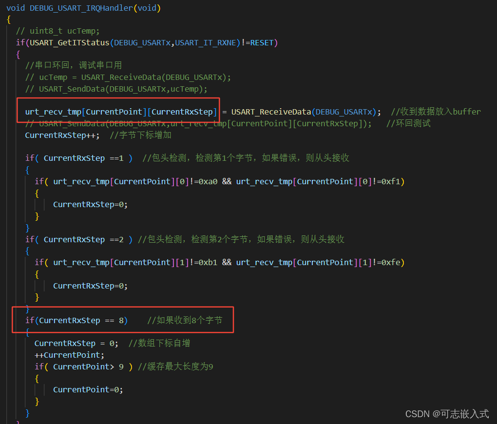 首先,代码开始执行时, PrePoint和CurrentPoint初始值都是0。当串口收到8个字节后,CurrentPoint增加1,这时PrePoint!=CurrentPoint,会进行命令复制,将串口收到的命令复制到UARTGetComm[ ]数组内。然后PrePoint自增,使得PrePoint和CurrentPoint再次相等。