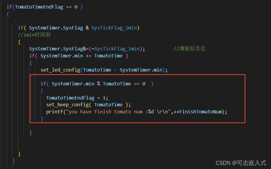 1)在控制时间的结构体中增加TimeFlag,用以设置单次运行模式,当时间超过25分钟后,通过对标号4,设置TimeFlag为1,便不再执行番茄番茄时钟程序