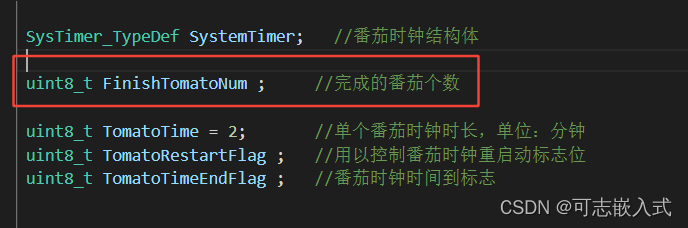 2. 在前面的SystemConter的结构体全局变量中,我们需要增加一个累计番茄的变量,这样每次完成一个番茄,通过串口输出出来。同时也可以通过串口命令,查询共计完成了几个番茄。