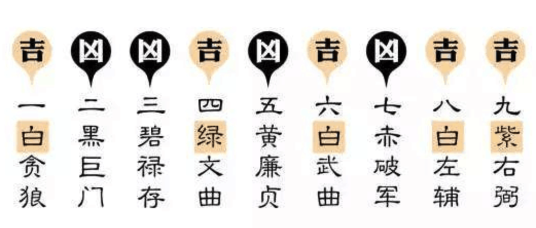 九星各有吉凶,以颜**别,成为七彩九星: