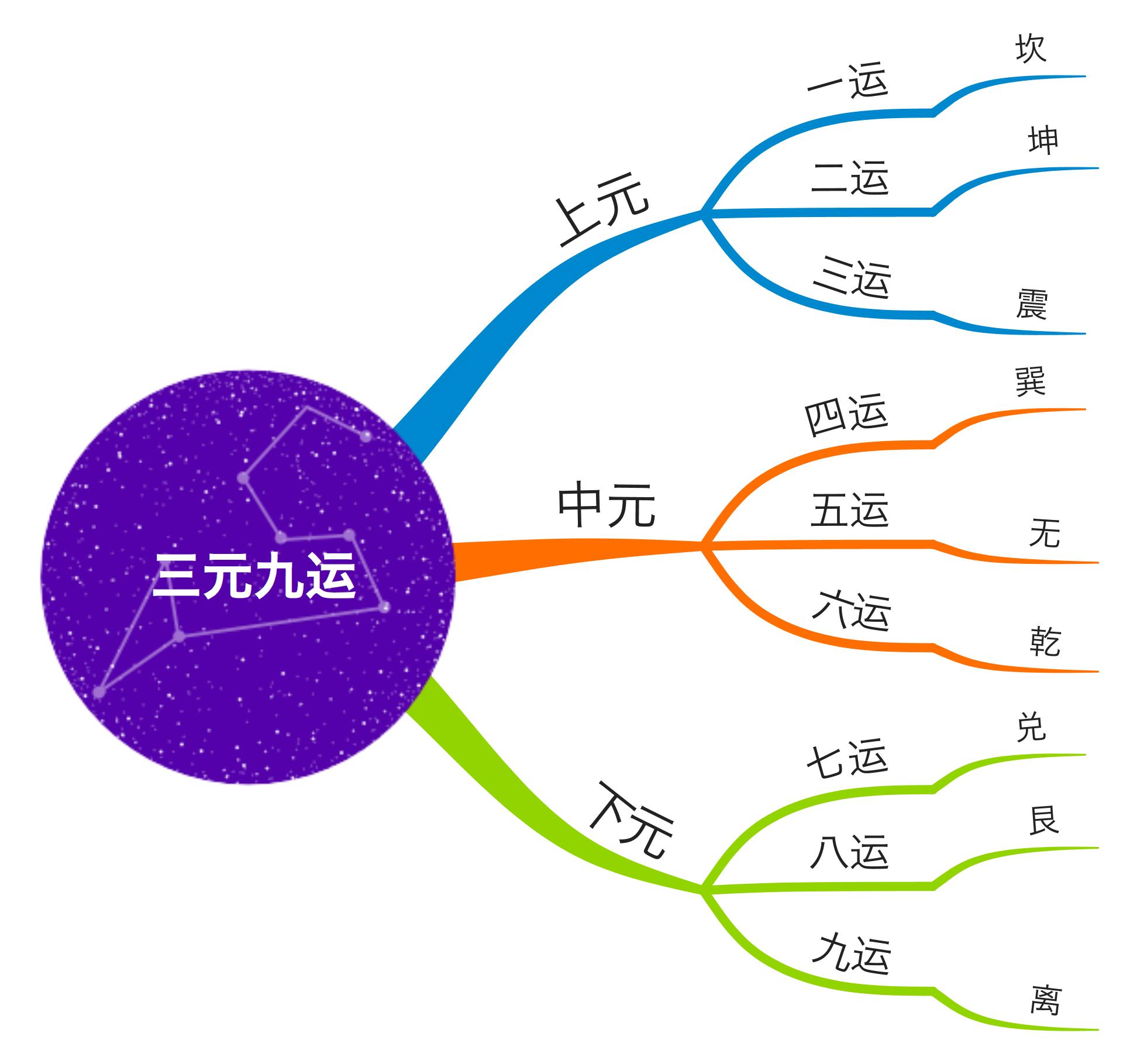 三元九运,是中国划分大时间的方法,古人把20年划分为一运,三个20年也就是三运,形成一元。三个元运就是上元、中元、下元,每一元三个运,合称为“三元九运”。上元是一、二、三运;中元是四、五、六运;下元是七、八、九运。每一个元运六十年,三元总共是180年。自古便记载于黄历上,并结合干支历使用,多用于风水学上。在太阳系的九大行星中,土星与木星每隔20年就要相会一次,处于同一直线;每隔60年,土星、木星、水星就要相会一次;每隔180年,九大行星就会处于太阳的同一侧,分布在一个小的扇面中,形成“九星连珠”。九星分布图如下所示: