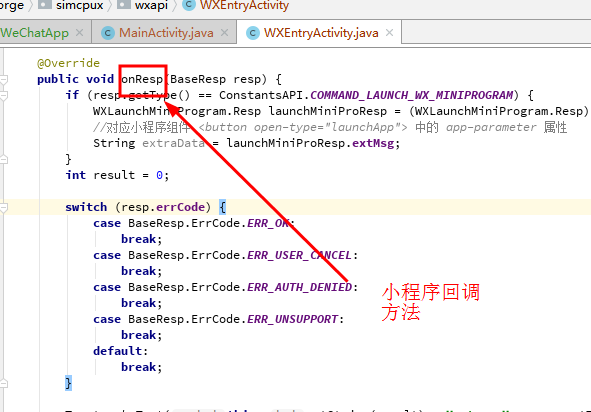 讯享网 @Override public void onResp(BaseResp resp) { if (resp.getType() == ConstantsAPI.COMMAND_LAUNCH_WX_MINIPROGRAM) { WXLaunchMiniProgram.Resp launchMiniProResp = (WXLaunchMiniProgram.Resp) resp; //对应小程序组件 <button open-type="launchApp"> 中的 app-parameter 属性 String extraData = launchMiniProResp.extMsg; } }