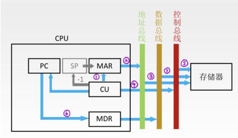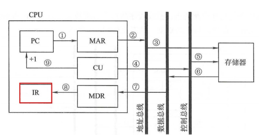 首先PC中存放的是当前指令的地址,该地址送到MAR并送至地址总线,然后控制单元CU向主存发出读命令,使对应MAR所指单元的内容经数据总线送至MDR,再送至IR,并且CU控制PC内容加1,形成下一条指令的地址。