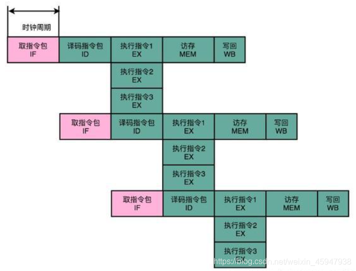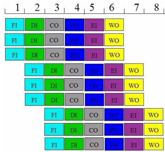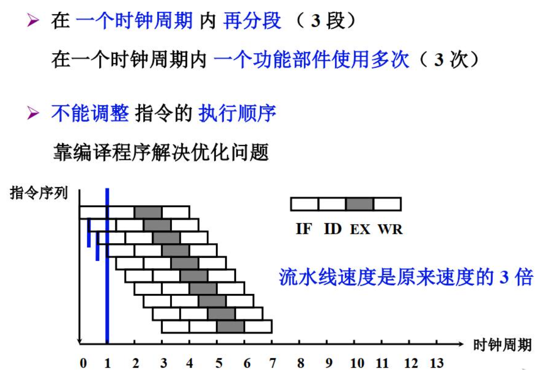 将流水线再分段,把原来的一个时钟周期又分成3段,使得超流水线的处理周期比普通流水线的周期短