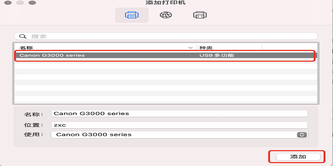 选中列表中的打印机,点击底部的添加按钮