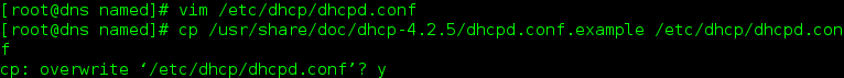 [root@dns named]# vim /etc/dhcp/dhcpd.conf 修改dhcp服务的主配置文件