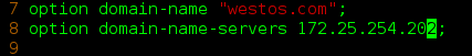 37 key westoskey { dhcp更新dns时用到的key 38 algorithm hmac-md5; 39 secret yJj4rDt/tp/5pqF2j3HxUw==; 40 }; 41 42 zone westos.com. { 指定dhcp更新的域名 43 primary 127.0.0.1; 指定dns所在的主机ip,这里127.0.0.1是内部回环接口,所以也可以用 44 key westoskey; 指定更新这个域时用到的key名称 45 };
