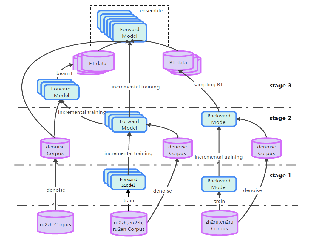 在训练过程,结合显式的课程学习技巧,根据噪音量划分三阶段增量式训练方案。在第一阶段,使用全量的带噪语料进行训练,使得模型快速收敛;第二阶段使用双语对齐工具去噪后进行增量训练;第三阶段使用增强后的降噪双语数据进行增量训练,完成模型最终收敛。