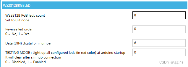 在绑定显示单元到Arduino中时,leds count 一定不要忘记填,我们这里是8位,就填8。 最开始配置只填写了1,结果只有1颗亮,还以为灯条有问题,花费了不少时间。