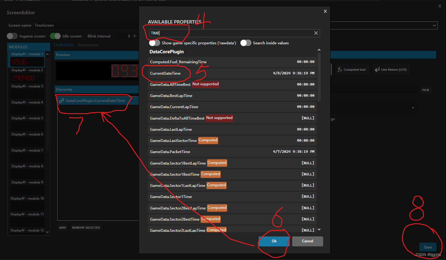先点击 0,“Display4F-module 1” ;→然后点击 1 ,ADD,增加要显示的内容;→点击2,“SimHub Property”,从SimHub中链接一个信息到当前编辑的屏幕;→点击3,PICK弹出可选属性参数的对话框;→点击4,输入参数的关键字,比如 time;→点击5,也就是我们找到的要添加的信息;→点击6,ok,对话框结束,在7的位置出现我们选择显示的内容的🔗链接名称;→点击8,Save,保存配置结果