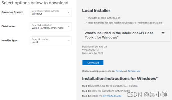 操作系统选择Windows,安装类型选择Local,VTune包含在Intel的oneAPI套件当中。在windows客户端,可以通过SSH远程连接到服务器,采集相关进程数据到客户端进行性能分析,性能分析结果将在可视化图形界面展示。