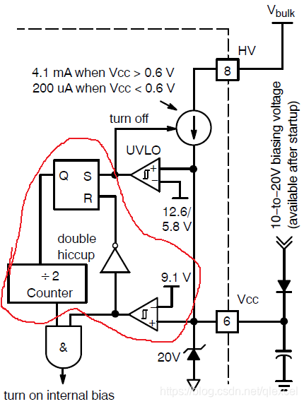 4、闩锁关闭模式:当1脚的电压高于8V,并持续13us,1271就会进入此模式。在此模式中1271会一直hiccup直到芯片复位。只有当VCC的电压低于4V,1271才会复位。因此错误模式的“double hiccup”是不会让1271复位的。只有给1271掉电,才能让VCC电压低于4V。