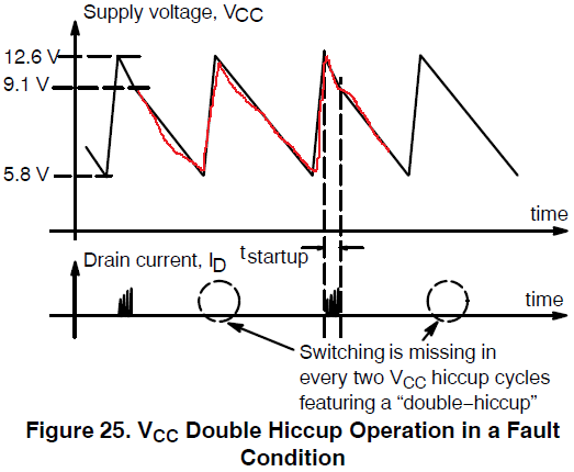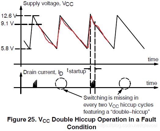 在错误模式中,VCC电压会进行“double hiccup”。首先DRV停止输出,因此VCC的电压会自然下降,当下降到5.8V,1271打开内部的FET给VCC充电,充电到12.6V,然后VCC的电压又会自然下降,当下降到5.8V,1271又打开内部的FET给VCC充电,充电到12.6V,这个时候DRV开始输出一段时间,尝试进入正常模式,如果错误解决了,1271就会进入正常模式,否则又会开始循环“double hiccup”直到错误解决。