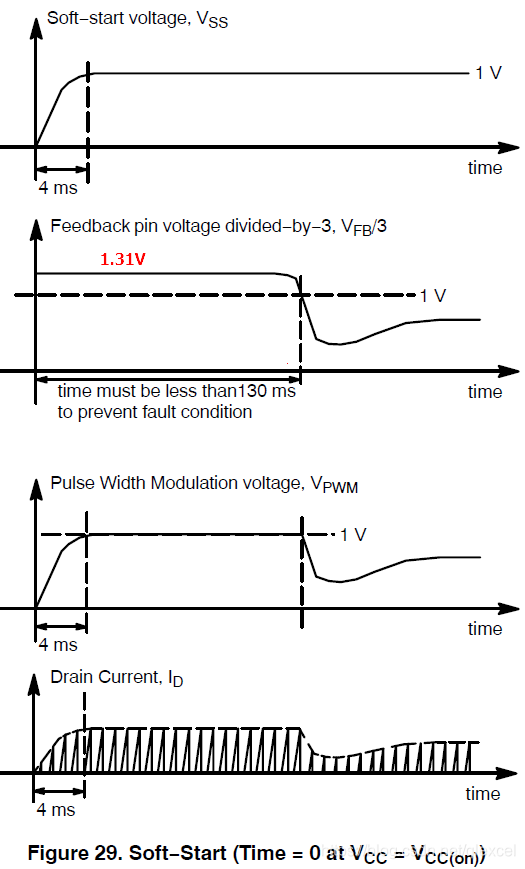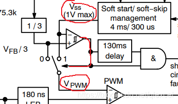 当给1271上电,VSS的电压会在4ms内从0V上升到1V,之后就一直保持在1V。VSS和VFB/3输入电压比较器,电压比较器输出结果会控制选择开关来决定VPWM的电压等于VSS还是VFB/3。当VSS大于VFB/3,比较器输出0,VPWM=VFB/3。当VSS小于VFB/3,比较器输出1,VPWM=VSS。因此VPWM等于VSS和VFB/3中的较小值。波形为: