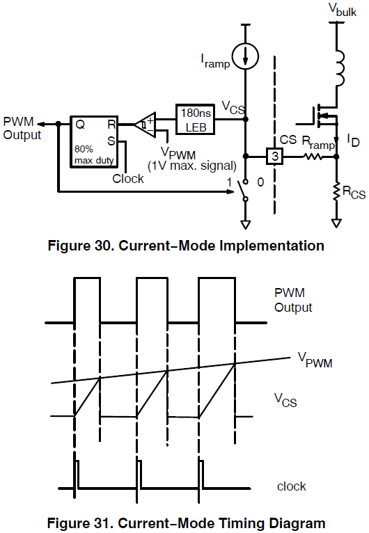 NCP1271的PWM同时带有主绕组电流反馈。电流采样电阻上的电压VCS和VPWM做比较,如果VCS小于VPWM,则比较器输出0,RS触发器的R端输入0,S端输入PWM的斩波(65K或100K)。当R=0,S=1,则Q输出1,控制外部FET打开。当VCS大于VPWM,比较器输出1,R端输入1,S端输入0,则Q端输出0,关闭外部FET。