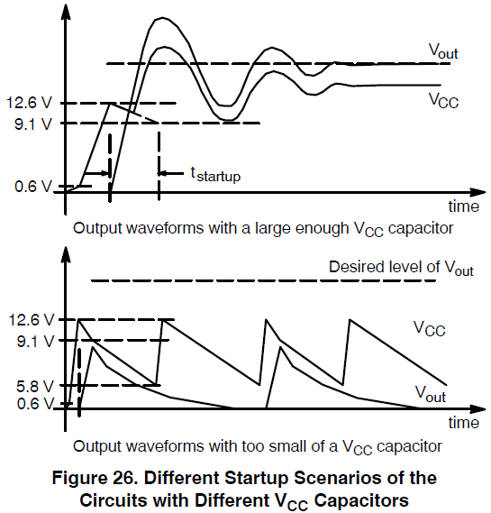 要保证VCC上的电容高于85uF。当然VCC的电压高于12.6,比如15V,则此电容值又要重新计算。如果不使用错误模式功能,则没有上面的限制,一般10uF就够了。VCC上的电容如果太小了,会导致1271启动不起来。