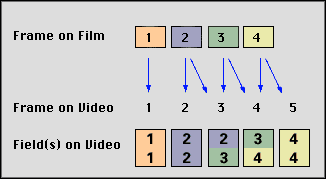 这个转换的方法叫做3:2 pull down。是将原视频拆分为偶场和奇场之后,在每两帧后添加一个第三帧的方法,如下图这般。