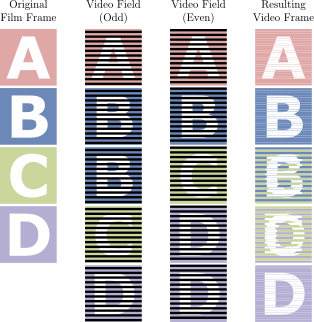 先扫描奇数行得到第一场(奇场/Field 1/Odd Field),然后扫描偶数行得到第二场(偶场/Field 2/Even Field)。两个场加起来组成完整的画幅。快速播放的时候由于视觉暂留效应,人眼不会注意到两场只有一半的扫描行,而会看到完整的一帧。