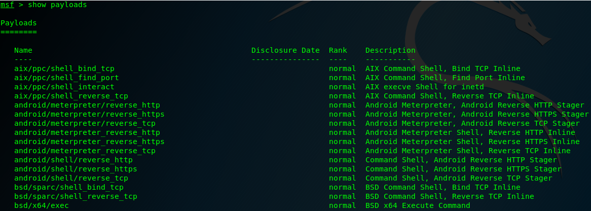 Metasploit框架中有三种不同类型的Payloads模块:Singles, Stagers, 和 Stages。这些不同的类型可以提供很多的多功能性,并且可以在多种类型的场景中使用。