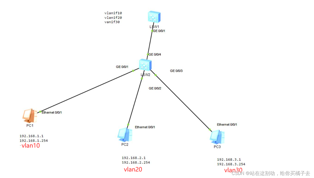 (纠正:这里的vlanif10-30 IP设置有误,虚拟端口的ip设置不能和pc的网关相同