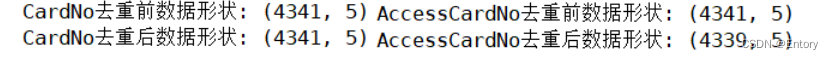 | # 查看data1的CardNo有没有重复值 data1_drop=data1.drop_duplicates(['CardNo']) print('CardNo去重前数据形状:',data1.shape) print('CardNo去重后数据形状:',data1_drop.shape) # 查看data1的AccessCardNo有没有重复值 data1_drop=data1.drop_duplicates(['AccessCardNo']) print('AccessCardNo去重前数据形状:',data1.shape) print('AccessCardNo去重后数据形状:',data1_drop.shape) |