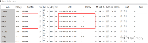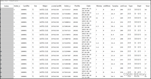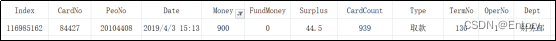 如图 10所示,卡号为的学生,在6点33、34、35分都有刷卡记录,通过计算在同一地点(第二食堂),就餐金额为4.5元,只要对re_index进行去重,统计频数,就可得出就餐次数。