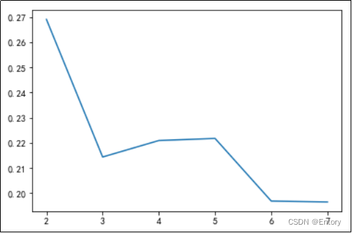 - 根据特征数据做标准化处理后,做出轮廓系数走势图,使用轮廓系数法确定聚类的分类簇的数量,如图 22所示。