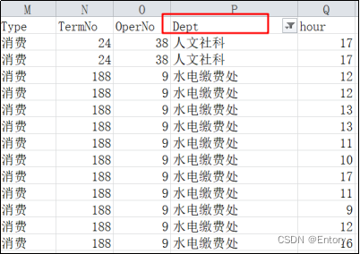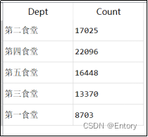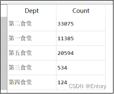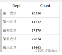 - 查看数据,如图 8所示,可以看到Dept字段除了有食堂类型外,还有其他地点,如人文社科等。根据要求,绘制的是学生就餐地点饼图,所以只提取有关食堂的记录,考虑到教师食堂一般不对学生开放,故不纳入学生就餐餐厅范围内。