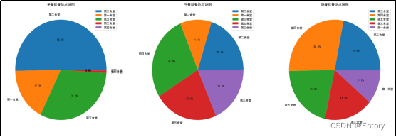 - 任务2.1 绘制各食堂就餐人次的占比饼图,分析学生早中晚餐的就餐地点是否有显著差别。