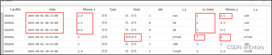 - 对re_index进行分组聚和,求一次就餐金额、刷卡时间和,并且进行去重;