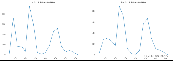 | # 画工作日和非工作日食堂就餐时间折线图 plt.rcParams['font.sans-serif'] = 'SimHei' # 设置中文显示 p = plt.figure(figsize = (18, 6)) # 将画布设定为正方形,则绘制的饼图是正圆 ax1 = p.add_subplot(1,2,1) plt.plot(data_gb1['hour'], data_gb1['label']) plt.title('工作日食堂就餐时间曲线图') ax2 = p.add_subplot(1,2,2) plt.plot(data_gb2['hour'], data_gb2['label']) plt.title('非工作日食堂就餐时间曲线图') plt.show() # 显示图形 data.to_csv('tmp/data2_new.csv',index = False,encoding = 'gbk') |