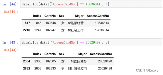 查看data1的重复值。因为每位学生的校园卡号和门禁卡号都唯一,所以要进行重复值检查。