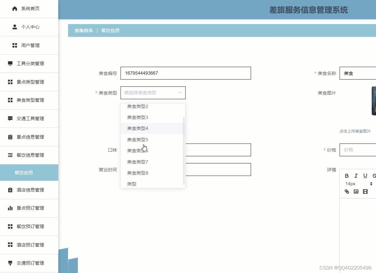 差旅服务信息管理系统根据实际情况分为前后台两部分,前台部分主要是让用户使用的,包括用户的注册登录,首页,交通工具,景点信息,餐饮信息,酒店信息,公告信息,后台管等功能;后台部分主要给管理员使用的,主要功能包括系统首页,个人中心,用户管理,工具分类管理,景点类型管理,美食类型管理,交通工具管理,景点信息管理,餐饮信息管理,酒店信息管理,景点预订管理,餐饮预订管理,酒店预订管理,交通预订管理,报销信息管理,系统管理等功能。通过这些功能基本可以满足差旅服务的需求。随着迅速的发展,差旅服务也较以前发生很大的变化,差旅服务系统以其独有的优势脱颖而出。“差旅服务信息管理系统”是以JAVA程序设计语言课为基础的设计出适合的差旅服务信息管理系统,其开发过程主要包括后台数据库的建立与维护、中间业务逻辑的处理及前端界面数据的显示与交互。