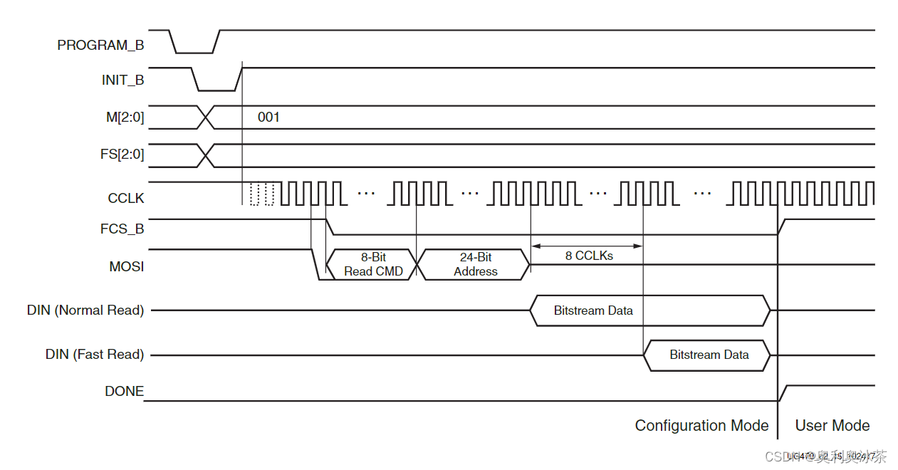 于是我研究了一下Xilinx的手册中对这部分功能的描述,想看看FPGA的上电时序究竟是个什么样子的。下面这个图是从UG470手册里面截取出来的,7系列FPGA SPI x1配置模式的时序。